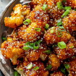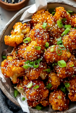 - Toss cooked cauliflower in the sauce, garnish with sesame seeds and green onions, and serve immediately.