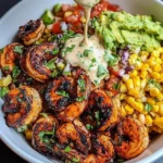 Enjoy a flavorful Grilled Shrimp Bowl with Avocado, Corn Salsa & Creamy Garlic Sauce that’s perfect for any meal. Try this tasty recipe today!