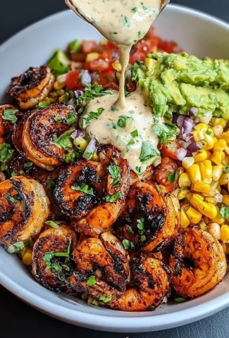 - Assemble bowls by layering corn salsa followed by grilled shrimp and avocado slices. Drizzle with creamy garlic sauce.