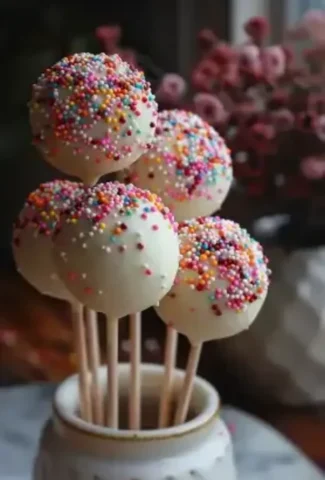 - Dip and Decorate: Melt the white chocolate or candy melts and dip each cake ball fully. Decorate with sprinkles before the chocolate sets.